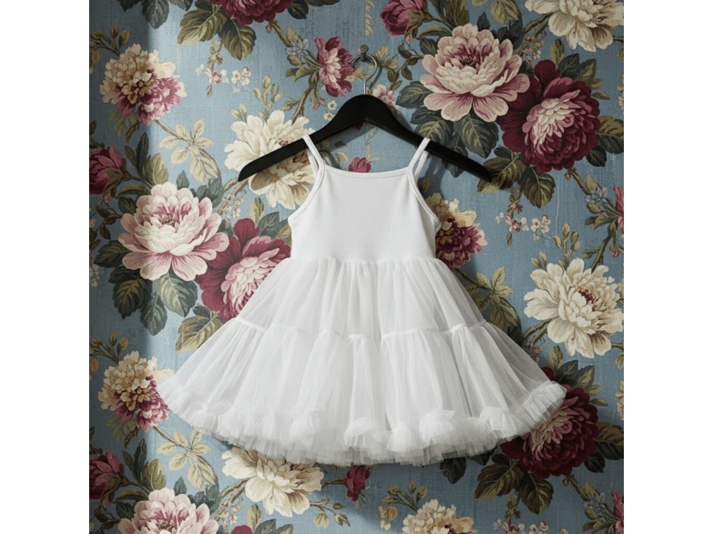 Okouzlující dívčí tutu šaty s tenkými spaghetti ramínky, z jemného šifónu a komfortního elastického bavlněného topu – dokonalé pro party, focení i každodenní fantazie.