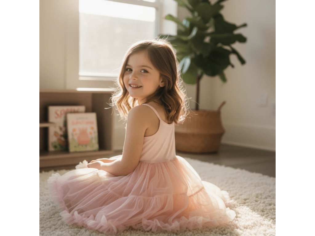 Okouzlující dívčí tutu šaty s tenkými spaghetti ramínky, z jemného šifónu a komfortního elastického bavlněného topu – dokonalé pro party, focení i každodenní fantazie.